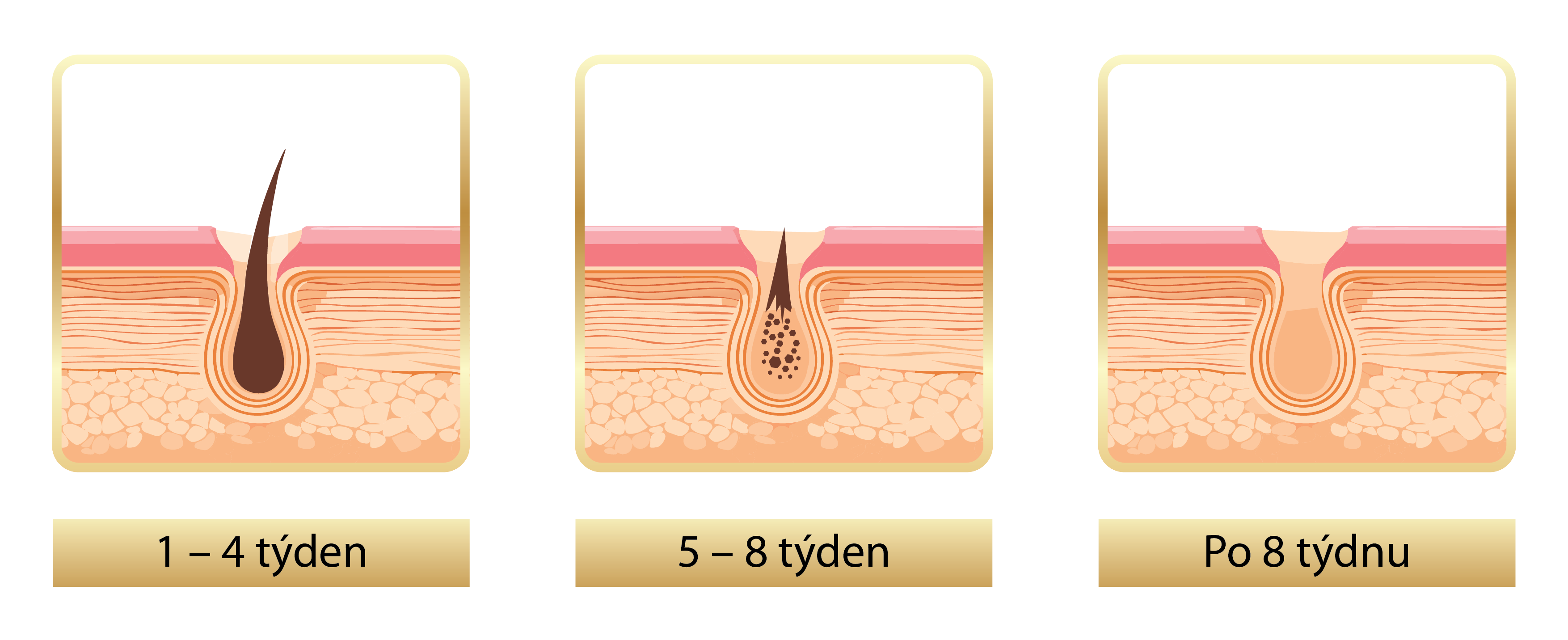 8+ týdnů: více než 90 % chloupků už vypadlo, růst se výrazně zpomalil.